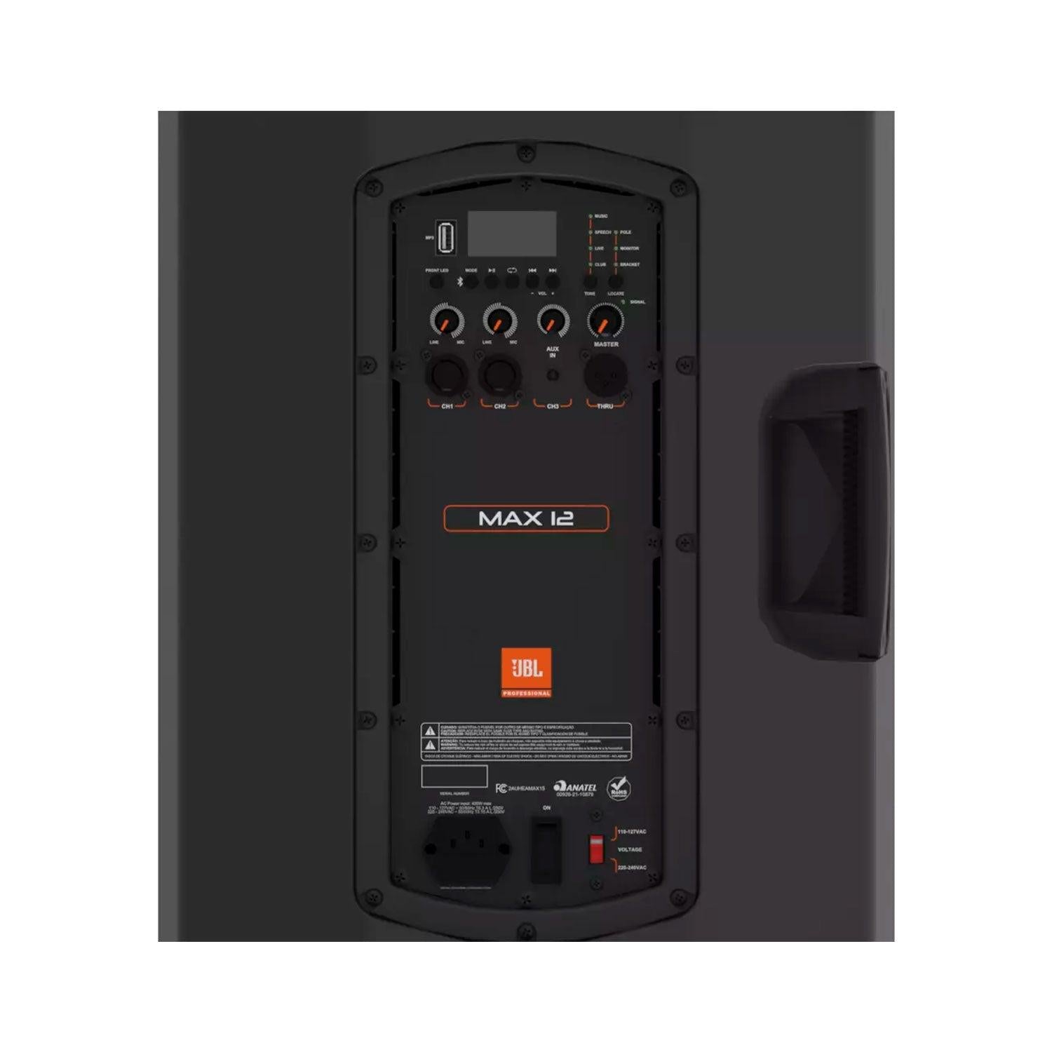 Max 12 forma parte de la nueva línea de parlantes profesionales potenciados que posee JBL, total facilidad de uso y un conjunto de funciones inigualable. Con un sonido de calidad, el parlante Max 12 entrega una potencia de 350w rms, su woofer de 12 pulgadas incluye un DSP y cuenta con un drive de 1,35 pulgadas. Con un simple toque elige el mejor ajuste entre cinco presets y tres más para la aplicación, además su reproductor multimedia integrado cuenta quince preajustes seleccionables para una amplia variedad de aplicaciones y estilos musicales. Reproduce la música que más desees desde un dispositivo móvil o Tablet con su conectividad vía bluetooth, su ajuste automático de ganancia entre el micrófono y la línea te da un verdadero sonido JBL de alto rendimiento. Utilízalo en el modo que quieras, como monitor, en un atril o colgado desde sus 3 puntos de anclaje, cuenta con dos entradas combo (XLR/plug) para un micrófono o instrumento, auxiliar, puerto USB y su copia de señal XLR te permite incluir un parlante adicional Max 12. CARACTERÍSTICAS: Parlante potenciado de doble vía. Woofer de 12 pulgadas con DSP. ESTRUCTURA: Polipropileno moldeado SPL máximo de 128dB. Respuesta de frecuencia (más menos 3 dB): 65 Hz - 16,5 kHz Respuesta de frecuencia (más menos 10 dB): 55 Hz - 19 kHz Campo de cobertura 100° horizontal x 60° vertical. Potencia de 300w rms el woofer y 50w rms el driver. Diámetro del woofer 12.0 pulgadas. Diámetro del driver de 1,35 pulgadas. Conexiones de entrada: 2 combo XLR/plug, un auxiliar, y puerto USB. Impedancia de entrada de 100Kohms. Conexión de salida: 1 XLR activo. Conexión vía bluetooth. DSP: Compresores preestablecidos, independientes y limitador / funciones de tono y localización. Alimentación 110-127v o 220v-240v. (seleccionable). Potencia máxima de consumo: 400wrms. Puntos de montaje: en atril de 35mm. Puntos de sujeción: 3 puntos con rosca estándar M10. Peso neto: 15,90kg. Medidas caja: 63 x 36,5 x 35,5cm. Medidas embalaje: 69 x 44,5 x 44,5. Peso caja: 18,55 kg.