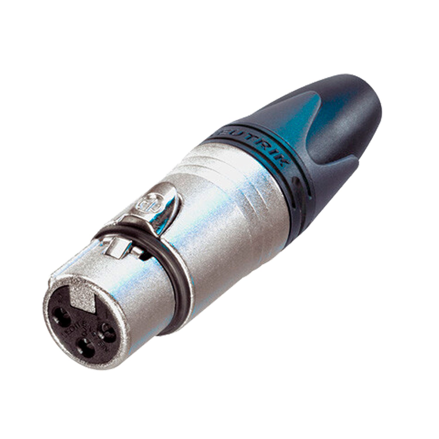 Conector de cable hembra de 3 polos con carcasa de níquel y contactos plateados.