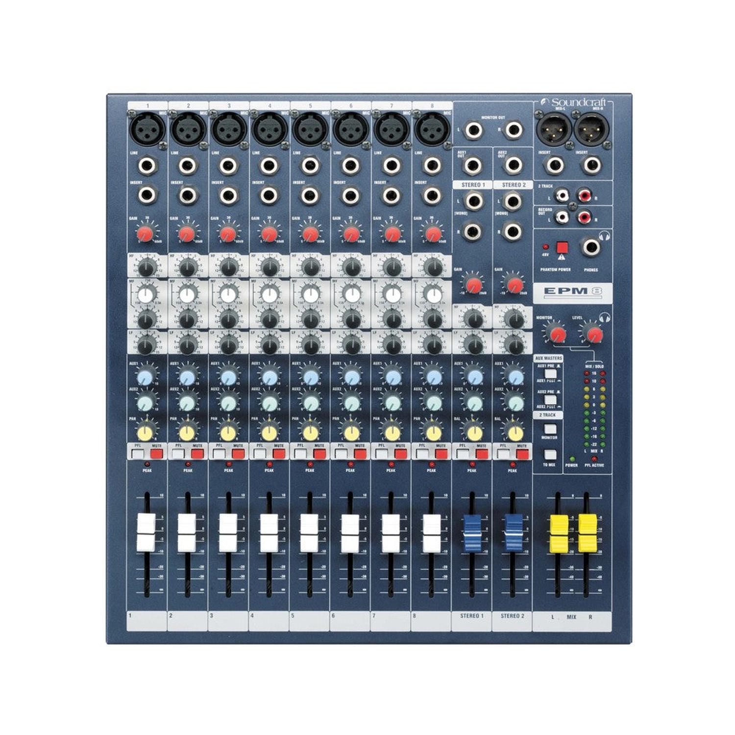 Clásica de Soundcraft, mezcladora de audio de 8 canales mono y 2 canales stereo. Construcción metálica con la misma calidad de sonido y bajo ruido de las series superiores. Muy baja incidencia de falla, lista para acompañarlo en estudio o aplicación en vivo por muchos años. Salidas balanceadas y construida con conectores Neutrik. 8 canales de entrada Monofónicas. 2 canales de entrada Stereo. Preamplificador 55dB y +22Db. Headroom sin saturación. Ecualizador 3 bandas con medios variables por cada canal. Insert en cada canal. 2 Aux Sends pre/post cambiables. Interruptor Solo/Mute por canal. Peak-LED dinámico por canal. Salida L/R balanceada en canon y salida monitor. Routing por separado para entrada Playback. Señal nivel LED x 10. Alimentación Phantom 48V. Fuente integrada 220V.