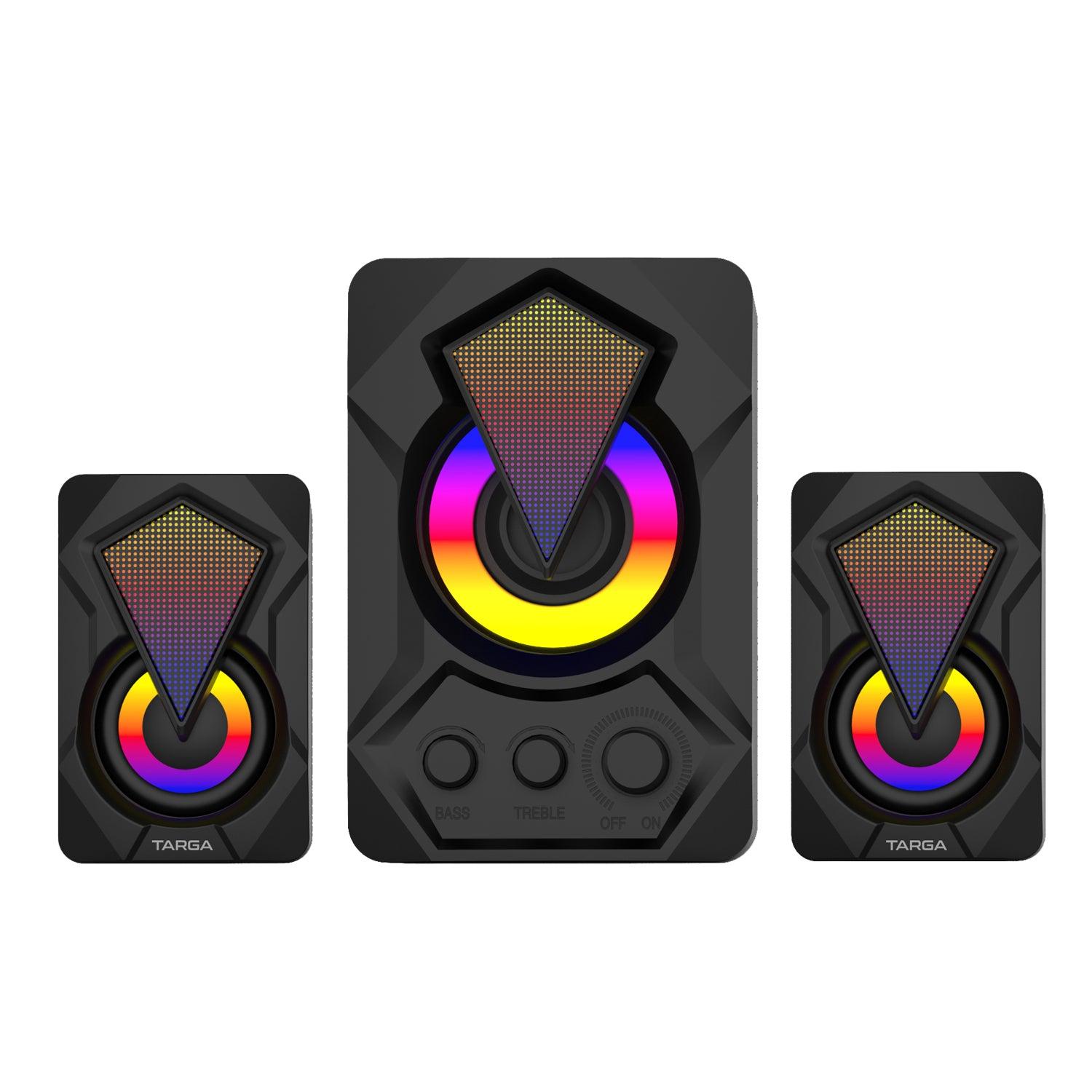 Los Diamond Pro de Targa son el sistema de sonido gamer definitivo para tu PC. Con tecnología 2.0 y conectividad USB/Jack 3.5mm plug & play, ofrecen un sonido envolvente potente, claro y preciso, ideal para una experiencia de juego inmersiva. Diseñados en EE.UU., este sistema cuenta con dos parlantes pasivos (2x4W) y un subwoofer activo (8W) para una profundidad de audio excepcional. Además, incorpora ajustes de bajos, altos y control de volumen, permitiéndote personalizar el sonido a tu gusto. Para completar la experiencia, sus luces LED Chroma FX con 7 modos añaden un toque dinámico y vibrante a tu setup. Características:Kit de parlantes gamer para PC.Conectividad USB/Jack 3,5mm plug and play.Chroma FX (7 modos led aleatorio).Control de bajos y agudos.Control general de volumen.Fuerte durabilidad.Entrada de energía: DC 5VPotencia de salida RMS: 8W + 2x4WTrabaja a una impedancia de 4 ohms.Su respuesta de frecuencia es de 40 Hz - 20 KHz.Señal a ruido de 70 dB.Peso neto: 740g.Dimensiones del sub: 10x10x15cm.Dimensiones de los parlantes 6x7x10cm.Medidas caja: 17.5x22x11cm.