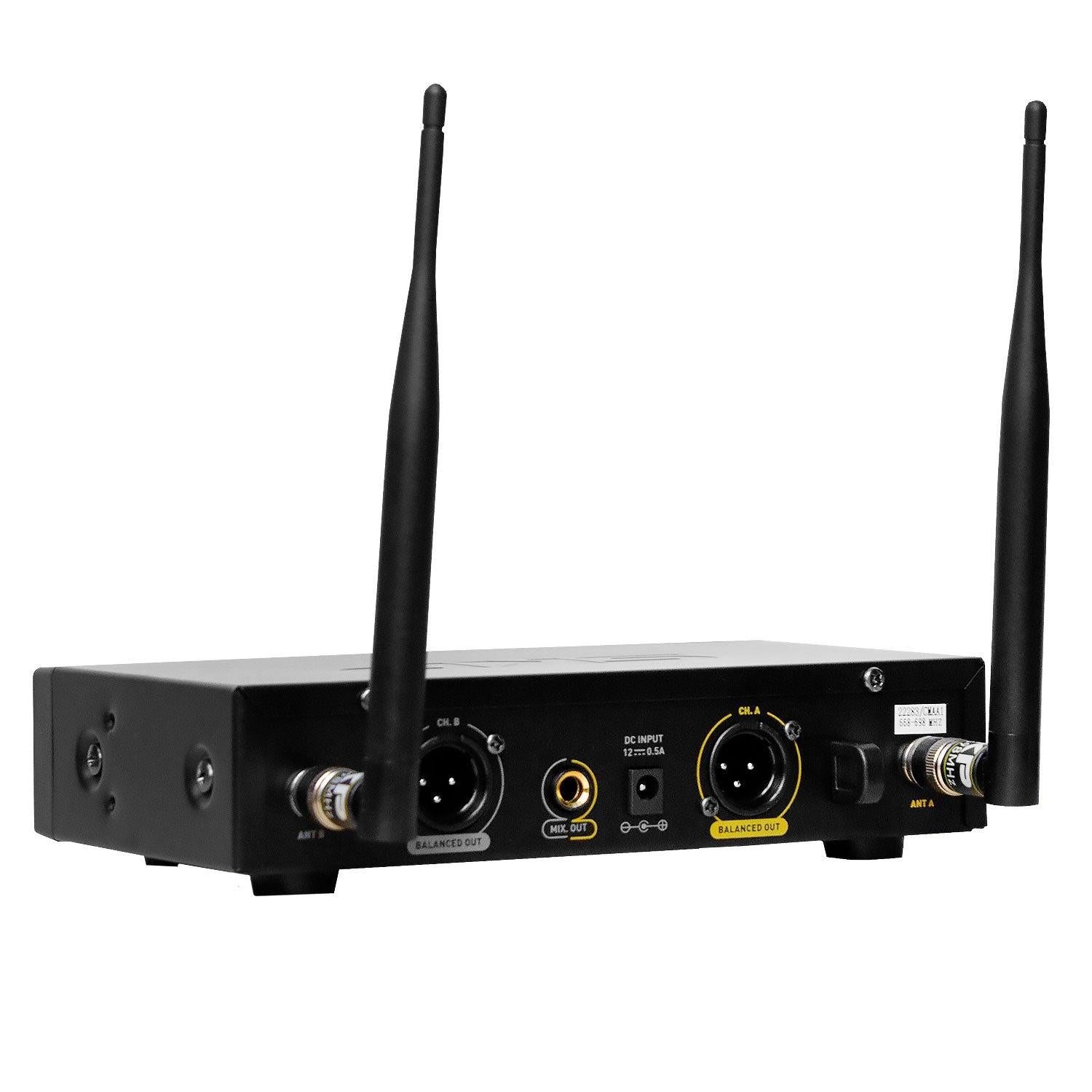 Este set incluye 2 micrófonos inalámbricos UHF y un receptor de estructura metálica, garantizando robustez y durabilidad para un uso intensivo. Su avanzado sistema de 300 canales seleccionables permite una operación libre de interferencias incluso en entornos saturados 📡.